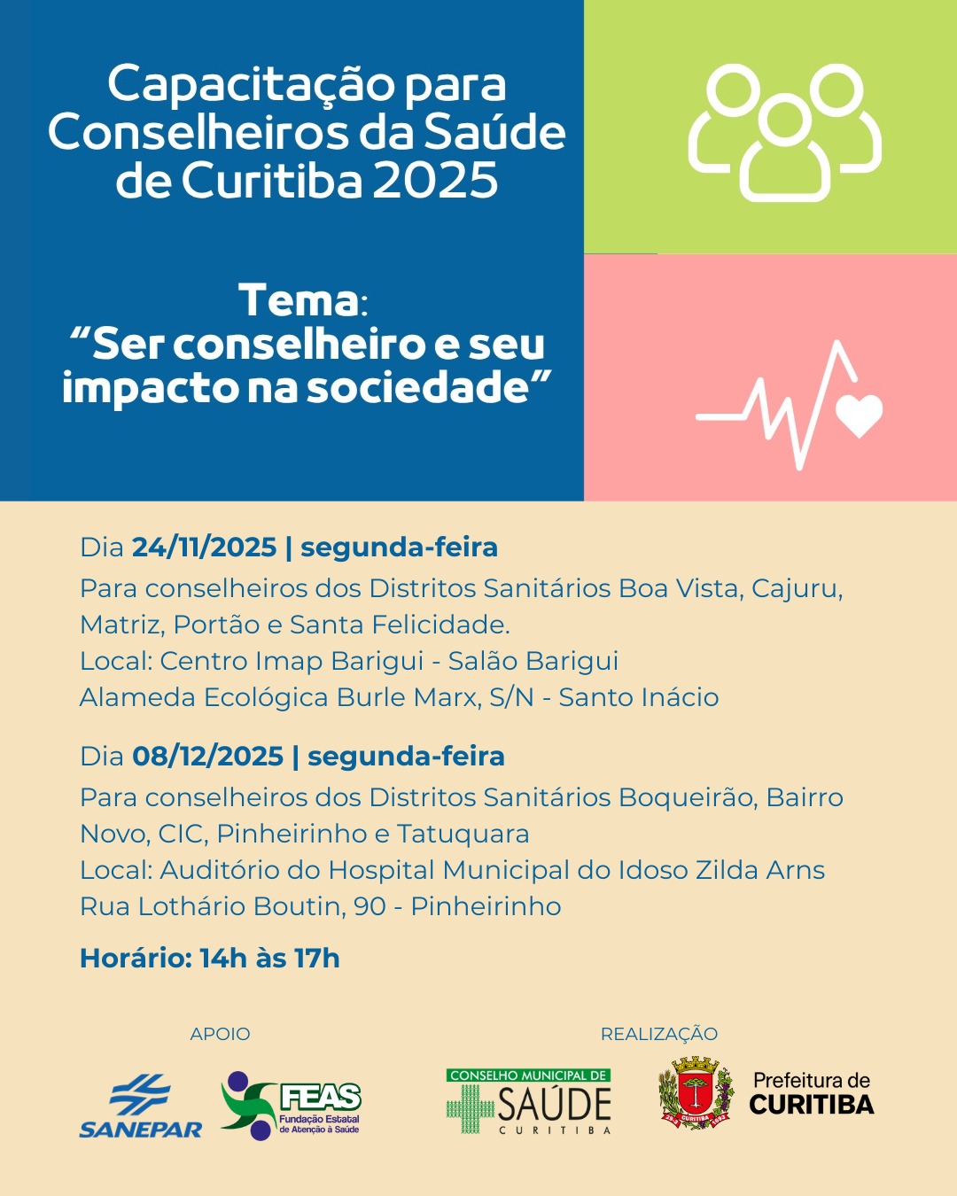 O Conselho Municipal de Saúde de Curitiba convida todos os conselheiros para a Capacitação 2025. As inscrições serão realizadas no local, conforme a orientação do convite quanto à divisão dos grupos, suas respectivas datas e locais.